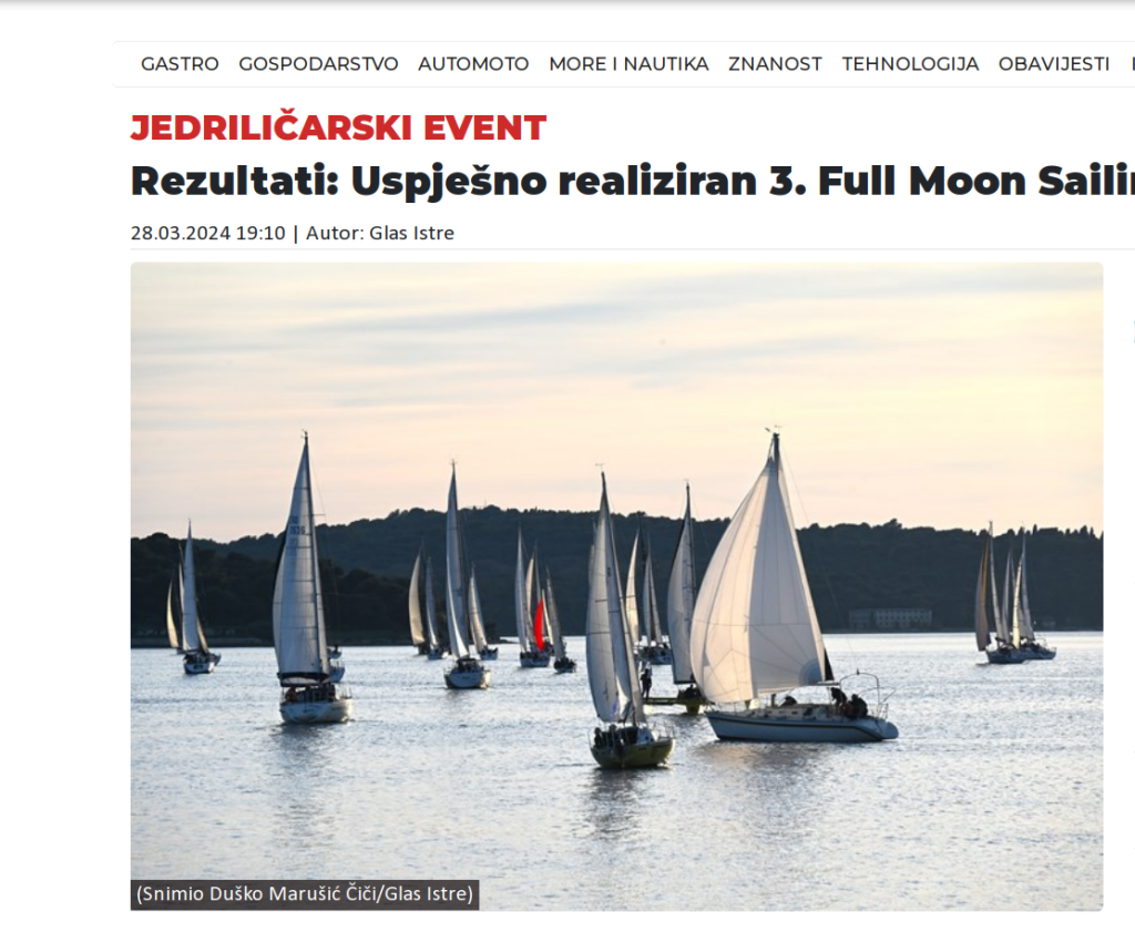FULL MOON NIGHT SPRINT Nastao je kao spontani odgovor na marčanu buru koja je puhala preko 40 čvorova i onemogućila navigacijsku regatu iz Pule do Cresa. Iako je planirana ruta morala biti odgođena za jutro, u pulskoj se luci okupilo čak 56 posada spremnih jedriti i po buri. U uzbudljivim uvjetima, uz prisutnost brojnih medija i fotografa, organiziran je noćni sprint – regata koja je oduševila i jedriličare i publiku te je od tada postala stalni dio programa koji se prati uz katamaran prepun posjetitelja, fotografa, sponzora i znatiželjnika željnih otkrivanja kako je biti na regatnom polju dok iskusni jedriličar komentira tijek regatavanja.