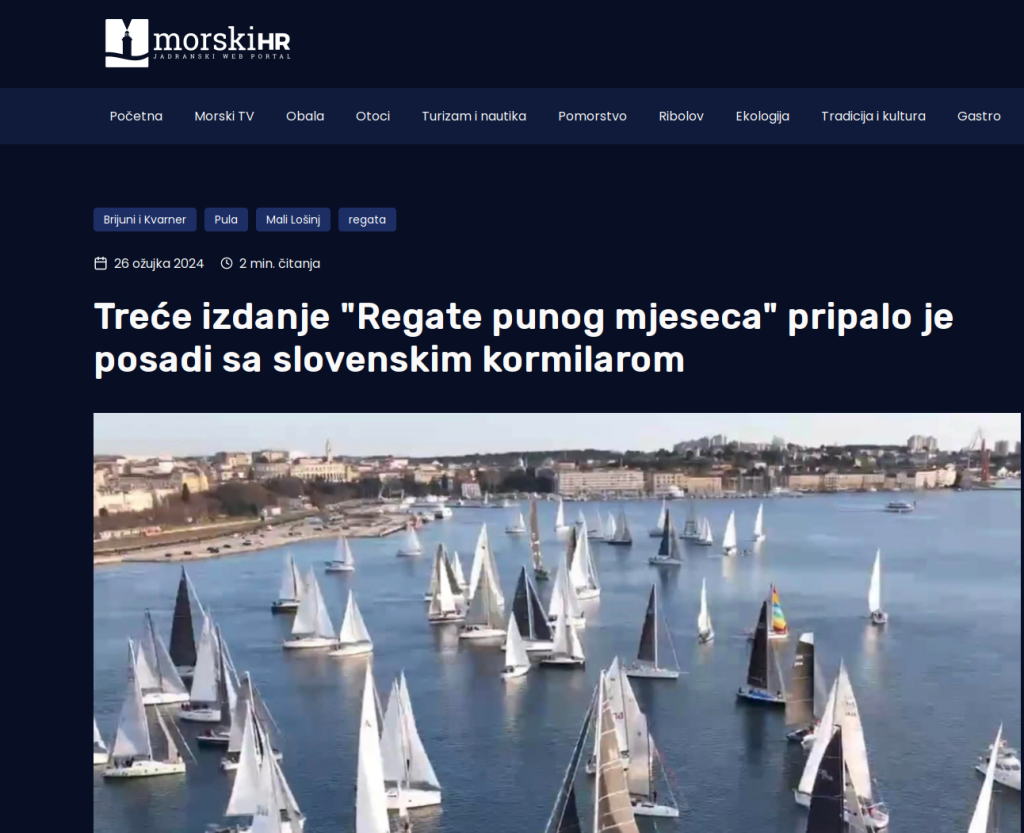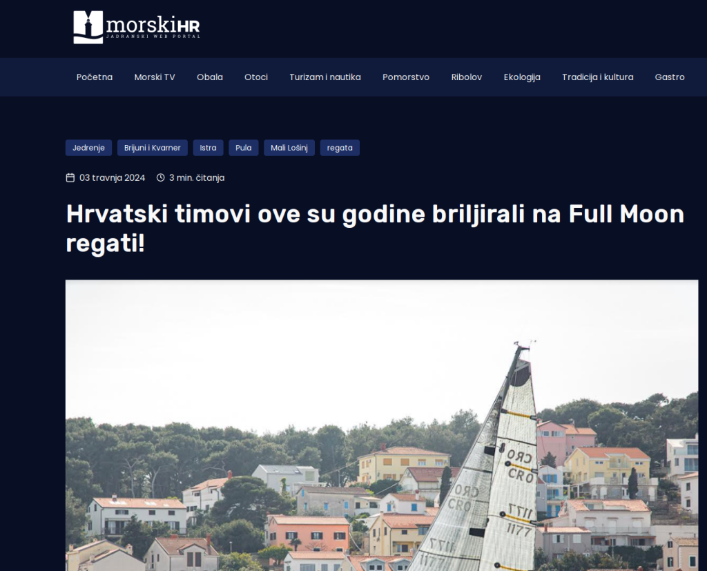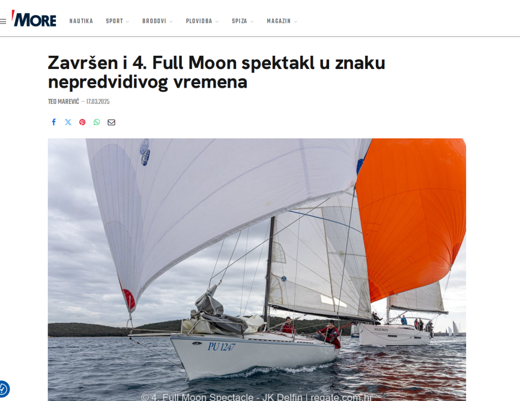 FULL MOON DAY RACE Jutarnji start u subotu vodi flotu prema Kvarneru. Dok se 2022. i 2023. jedrilo na ruti Pula – Cres, marčane bure 2024. godine usmjerile su regatu prema Malom Lošinju, a ta je ruta ponovljena i 2025. godine.