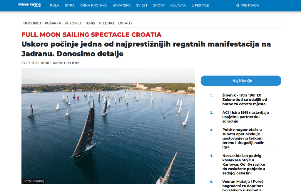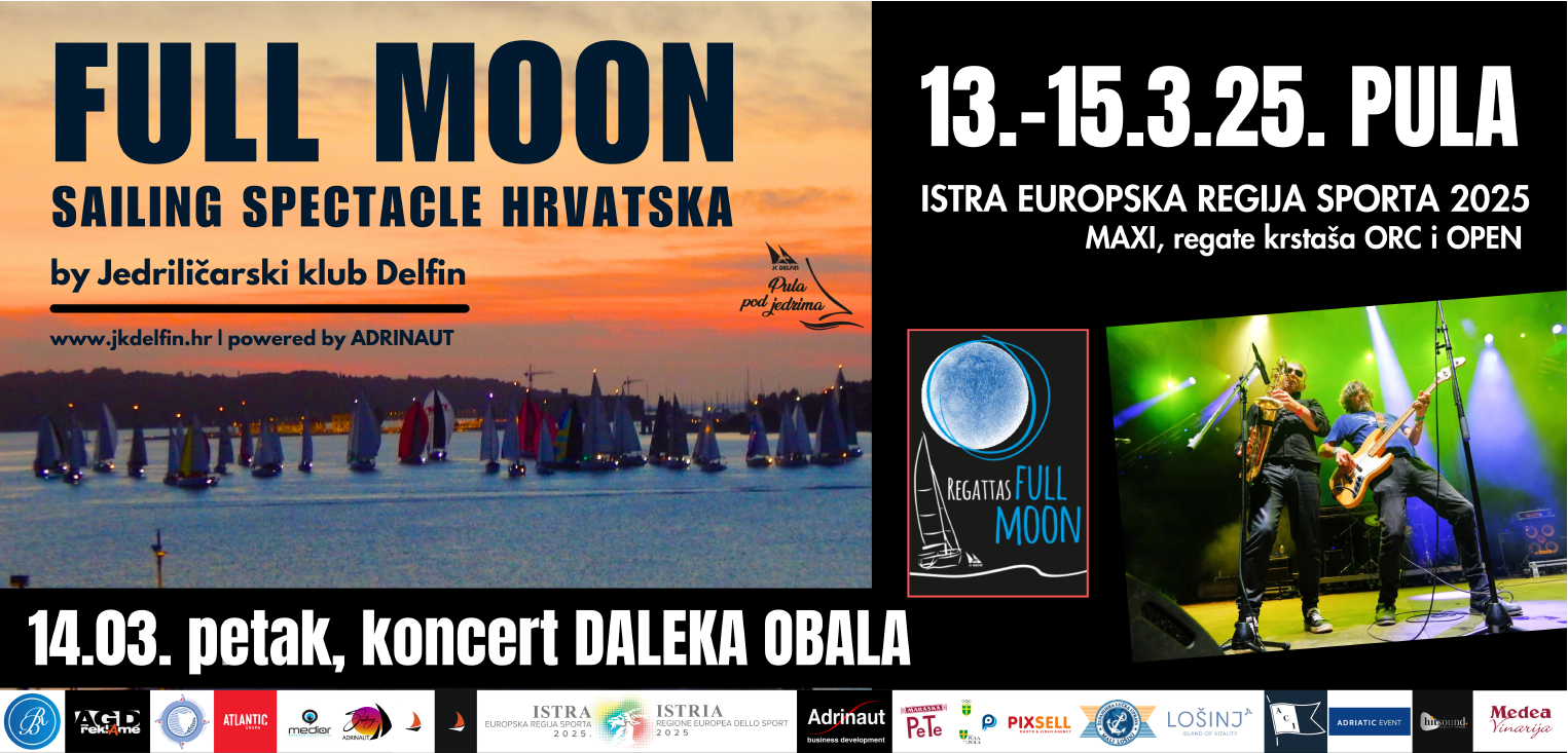 Peto izdanje Full Moon Sailing Spectacle-a održat će se u Puli i Istri, posljednjeg vikenda ožujka, od 26. do 29. ožujka 2026., ususret punom mjesecu. U planu su tri regate: Full Moon Classic – revija drvenih barki i maritimne baštine, Night Sprint Pula – međunarodno natjecanje u klasi krstaš (OPEN i ORC), Day Race Istra – međunarodno natjecanje u klasi krstaš (OPEN i ORC) Uz regatni sportski program, očekuje se bogat prateći sadržaj: film, glazba, kulturno-umjetnički program i sudjelovanje brojnih lokalnih dionika, čime se Pula pod jedrima pretvara u jedinstveni doživljaj mora, vjetra, sporta i kulture.