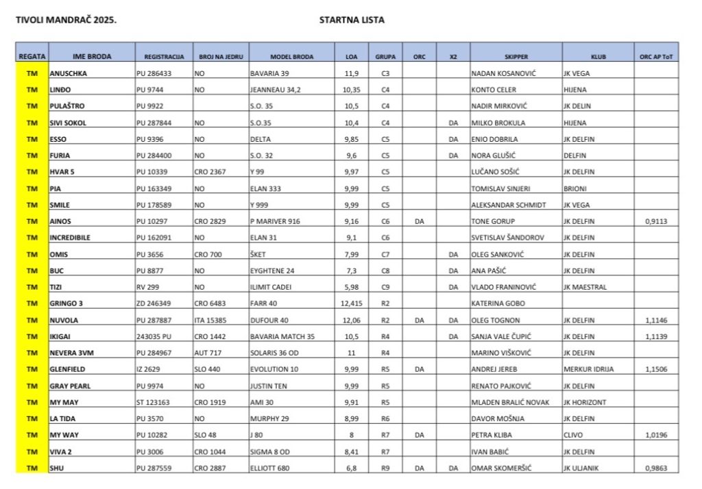 STARTNA LISTA PO ZATVARANJU PRIJAVA I RUTA JEDRENJA - TIVOLI MANDRAČ KUP 2025
