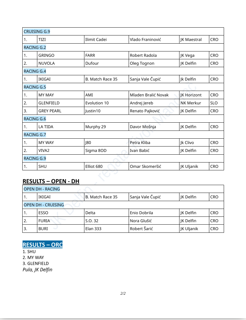 Ukupno najbrži brod regate po vremenu ulaska u cilj je FLY 5, a po ORC međunarodnom premjeru EXTRA LARGE.